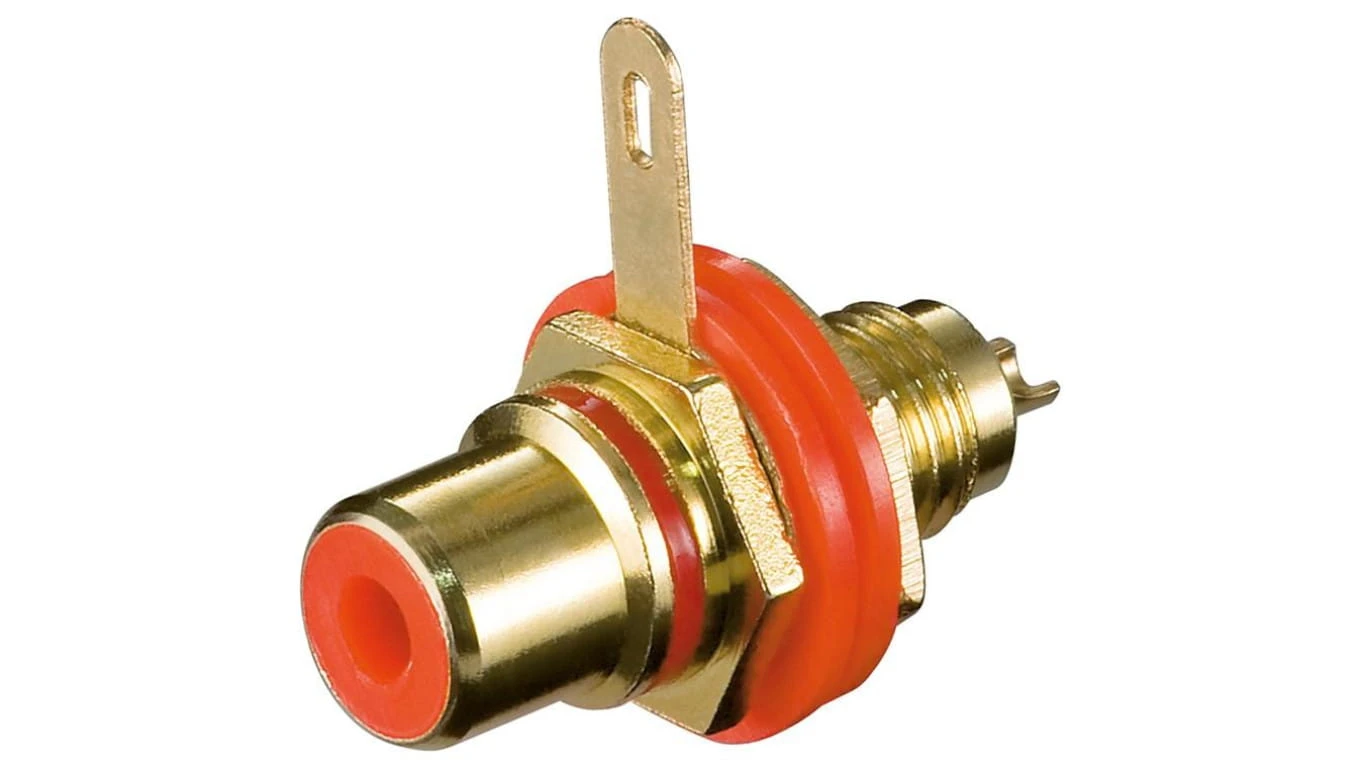 Gniazdo cinch do montażu w obudowie z izolacją i przyłączem lutowanym - Wersja kolorystyczna Czerwony